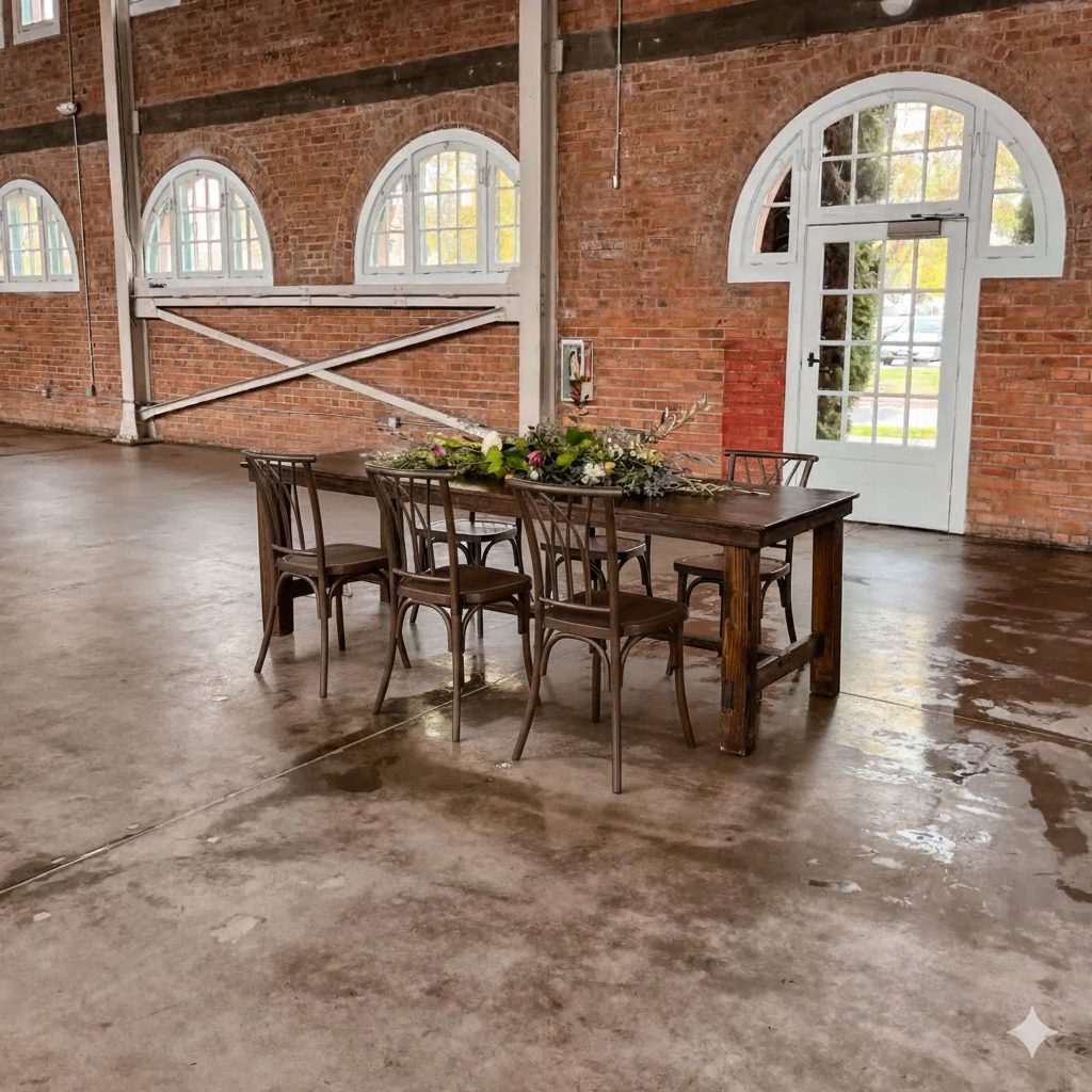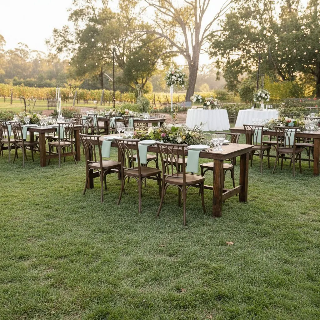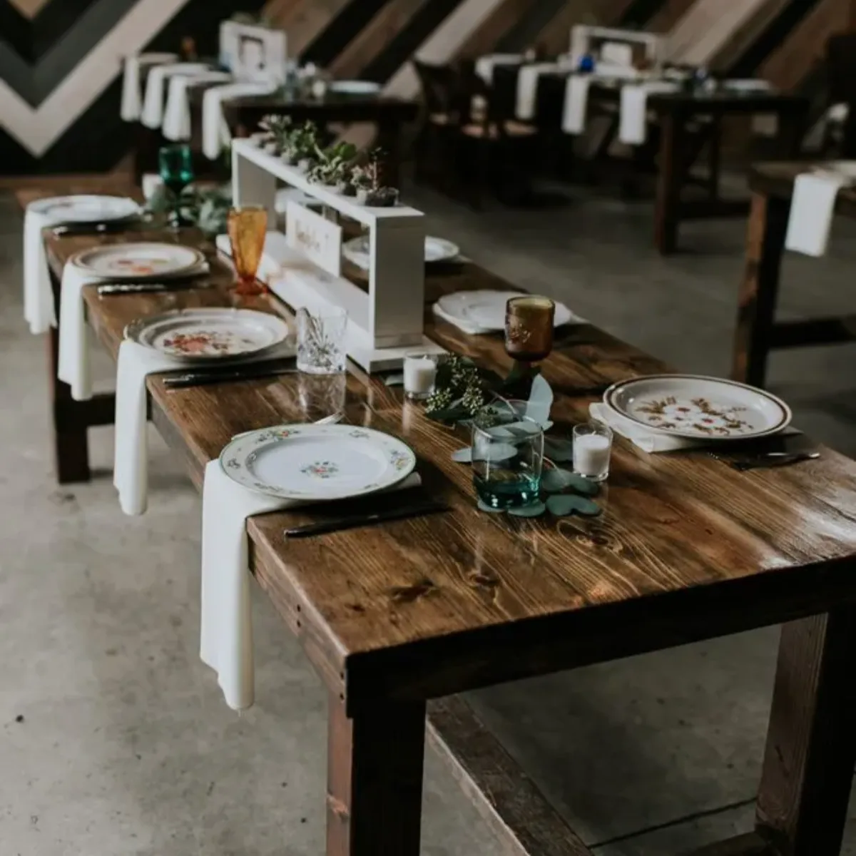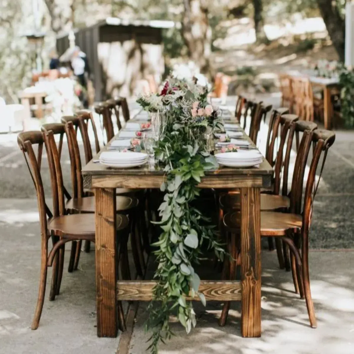 Our rental farm tables are all handmade and stained with a dark walnut finish. Each farm table is slightly glossy and polyurethaned for outdoor use so you do not need to worry about water marks or stains on the wood during your event. Each table is meticulously maintained to a high standard by our team. We take great pride in the quality and care of our products.