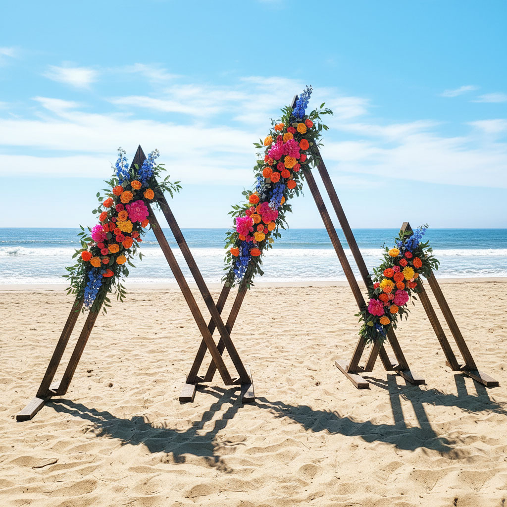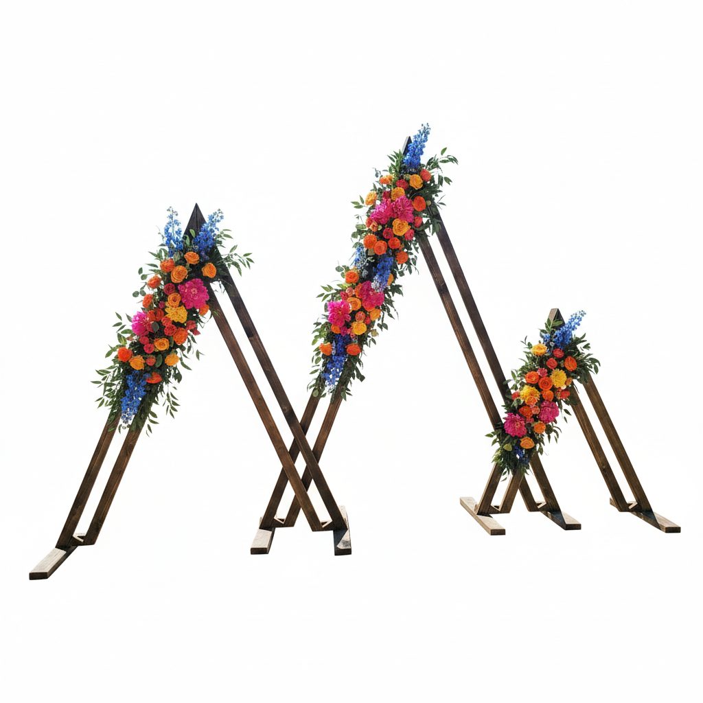This handmade triangle mountain arch rental item is the perfect accent to any event. Use as a backdrop for your ceremony, for your bar, or behind one of our lounges. Each triangle is individual and can be arranged in 3 different ways.