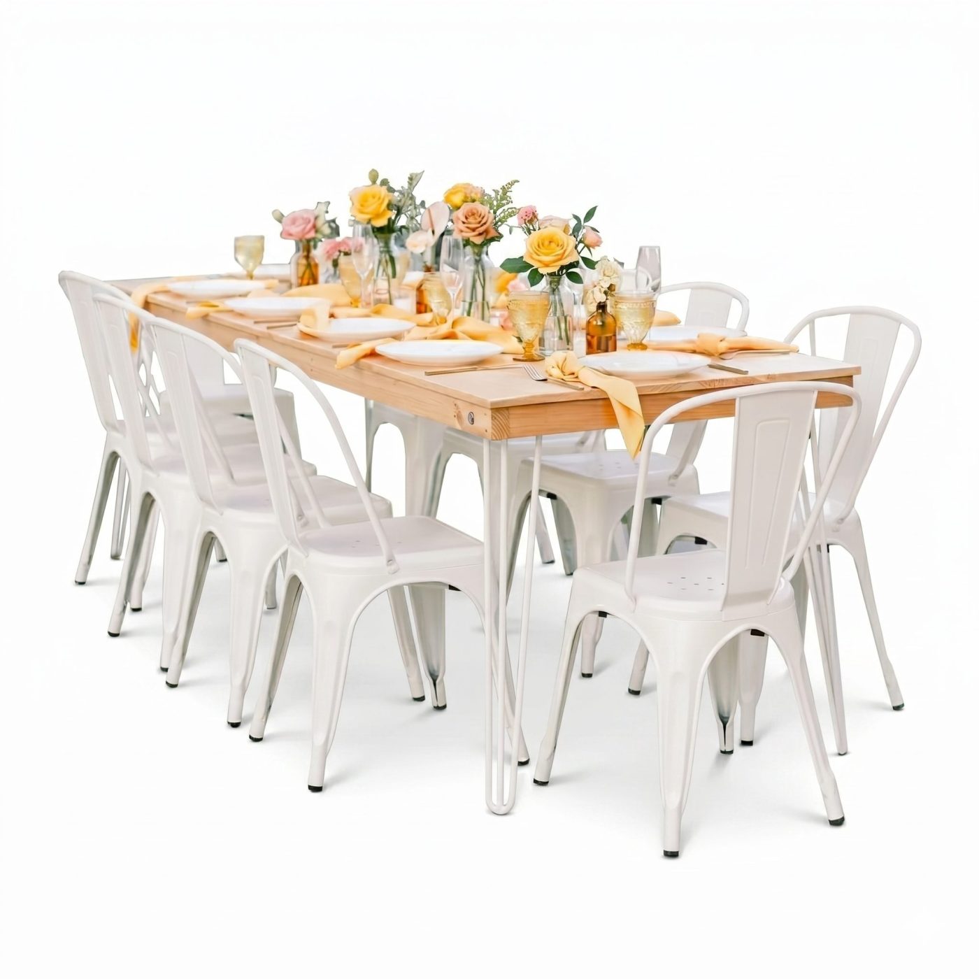Our light honey wood farm table rentals offer a bright and stylish alternative to our classic Hickory Farm Tables. Available with black or white hairpin legs, they pair beautifully with our metal bistro chairs for a cohesive and modern look.